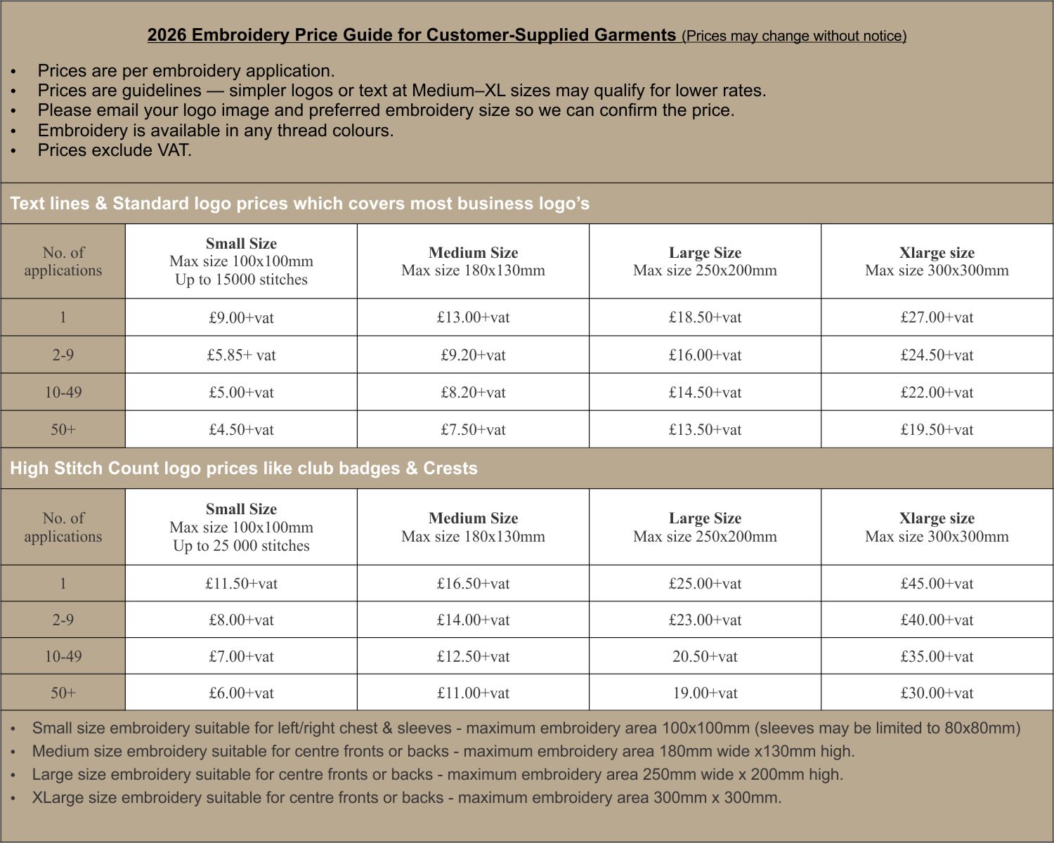 - Embroidery sizes and prices are guidelines only. Email us your requirements and logo image for an accurate quote.