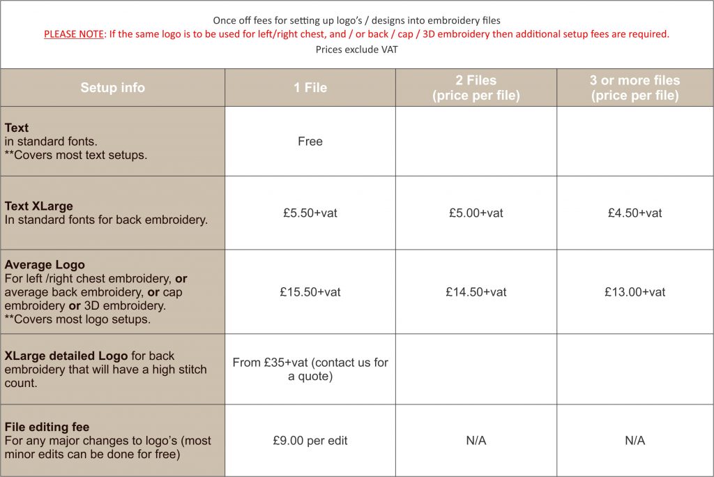 Editing embroidery files – Simple edits / adjustments can be made to logo’s after they have been setup into embroidery files which can be done in-house for free however if more complicated edits are required then this will need to be done by our specialist digitising team and an extra fee would be required for this service.
